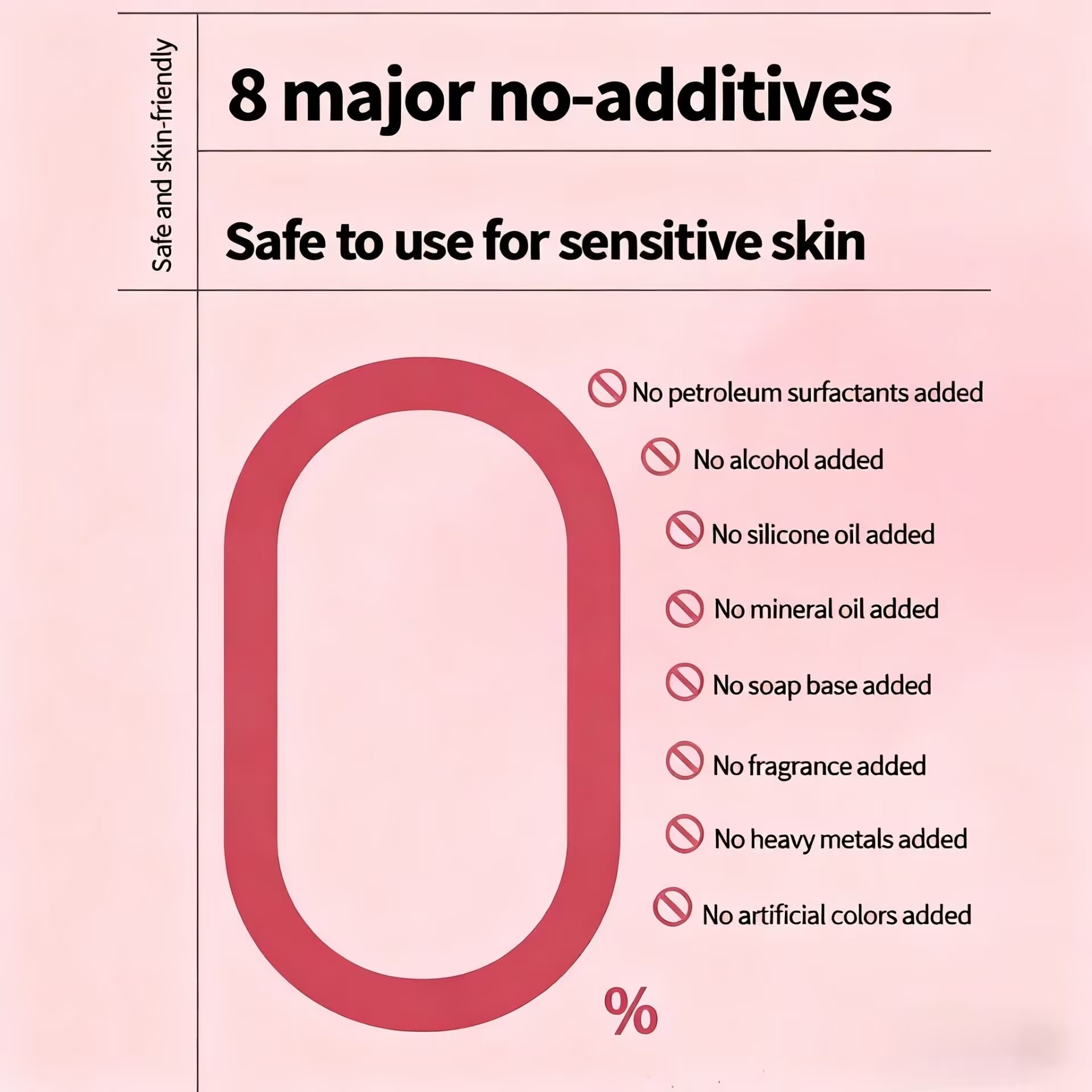 Safe & Clean – 8 major no-additives: free of petroleum surfactants, alcohol, silicone oil, mineral oil, soap base, fragrance, heavy metals, and artificial colors.